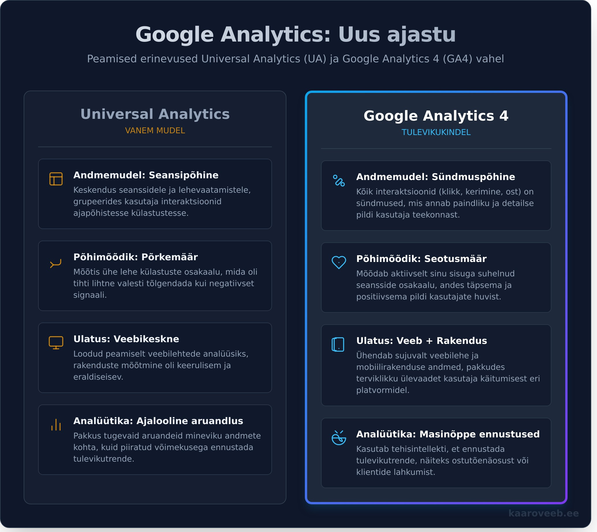 Kuigi mõlemad tööriistad kannavad Google Analyticsi nime, on nende aluspõhimõtted väga erinevad. Siin on neli peamist muudatust, mis teevad GA4-st täiesti uue platvormi: